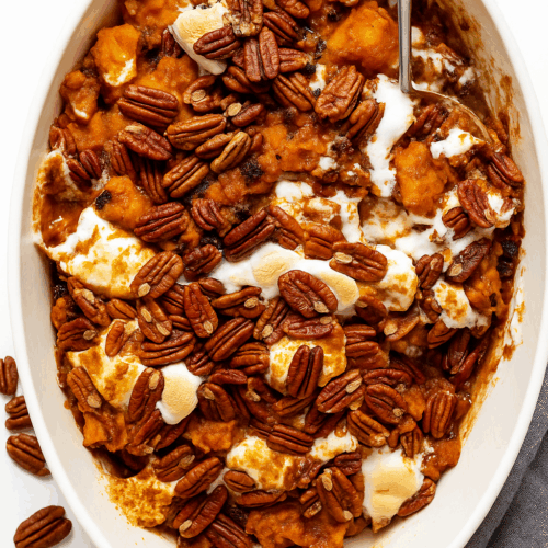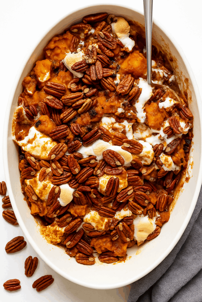 Brown Butter Maple Sweet Potato Casserole with Crunchy Pecan Topping
