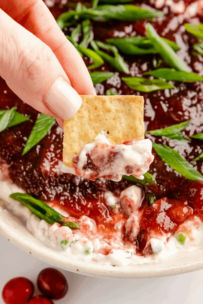 • Make-Ahead Prep: You can prepare the entire dip both the cream cheese base and the cranberry layer up to 2 days in advance. Simply cover the dish tightly with plastic wrap and store it in the refrigerator. The flavours actually deepen beautifully overnight!