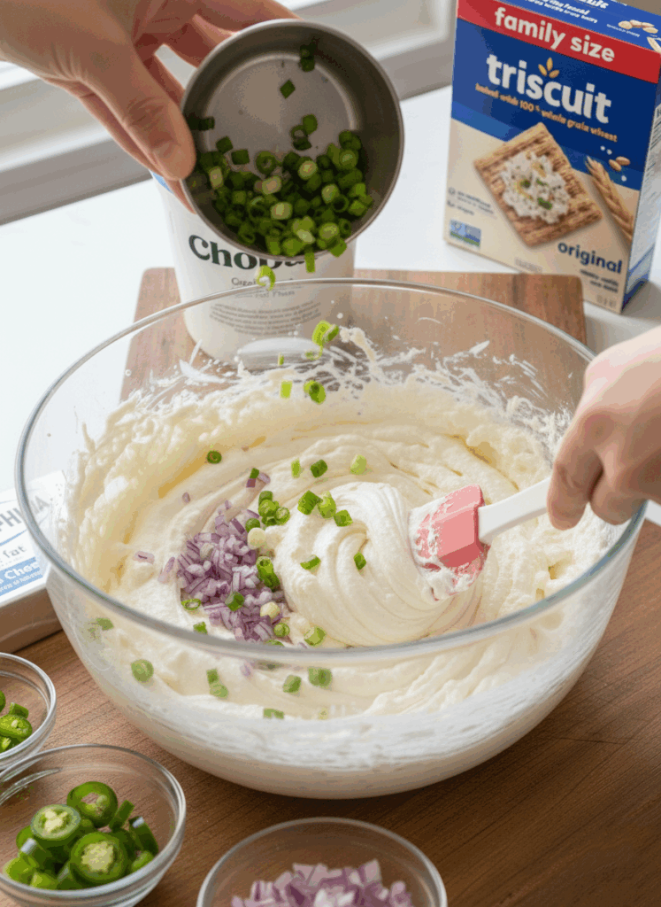 The goal when combining the cream cheese and Greek yogurt is aeration. As you use a hand mixer (or the paddle attachment on a stand mixer) on medium-high speed, you are forcing air into the dairy. This lightens the density of the cream cheese, which is naturally heavy, and integrates the thinner Greek yogurt perfectly. The mixture should increase slightly in volume and look marshmallow-soft. This texture is what allows it to be easily scooped by a cracker or veggie stick later.