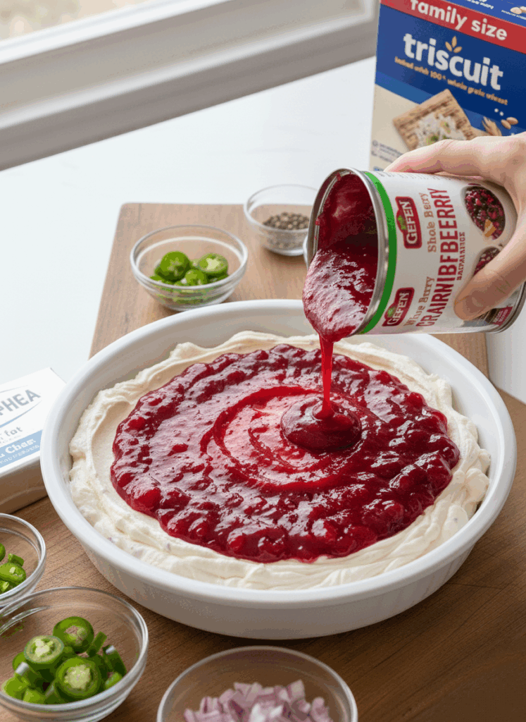 4. Pour (or spoon) the cranberry sauce on top of the cream cheese-yogurt base and gently spread it out to form the top layer. The contrast white/creamy bottom, bright cranberry top gives that striking “dip you want to photograph” look.