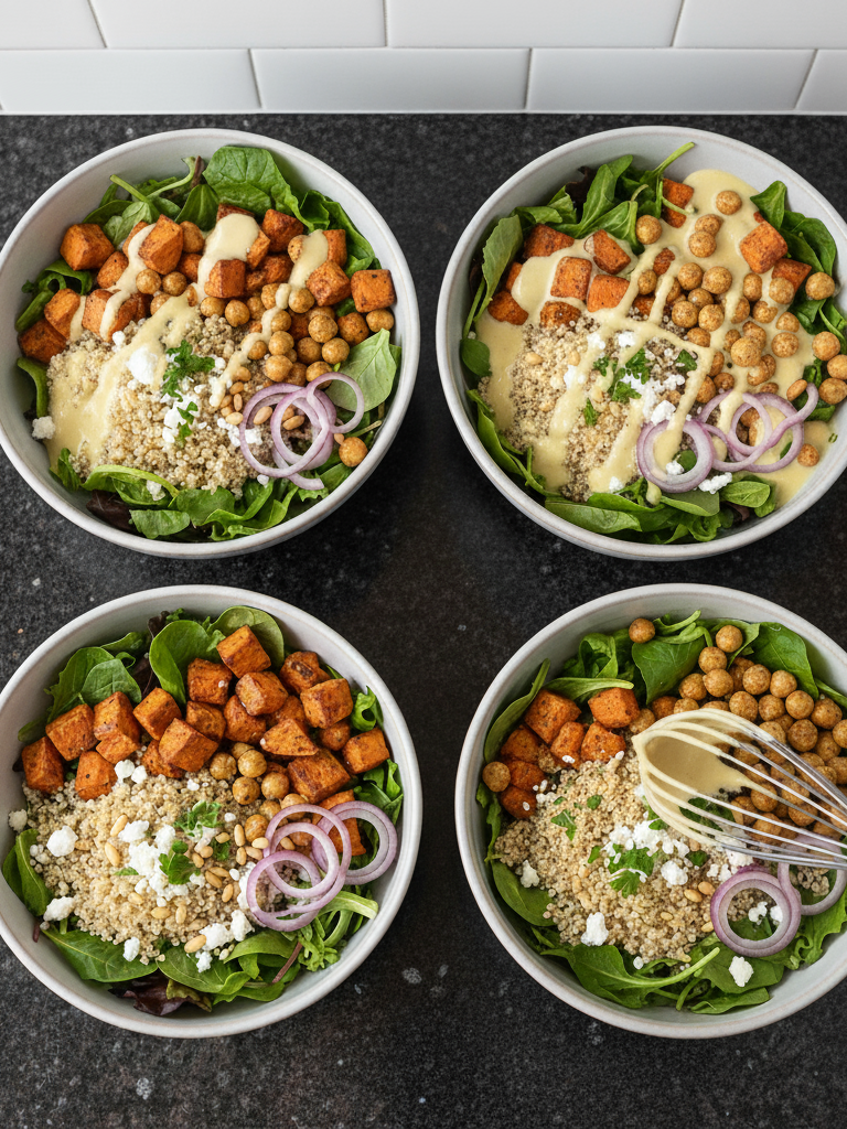 3. Assembly: When ready to eat, simply combine the quinoa and greens. Reheat the roasted vegetables (which can be done in the microwave or a toaster oven for extra crispiness) and add them to the bowl. Drizzle with the dressing, add fresh toppings, and enjoy!