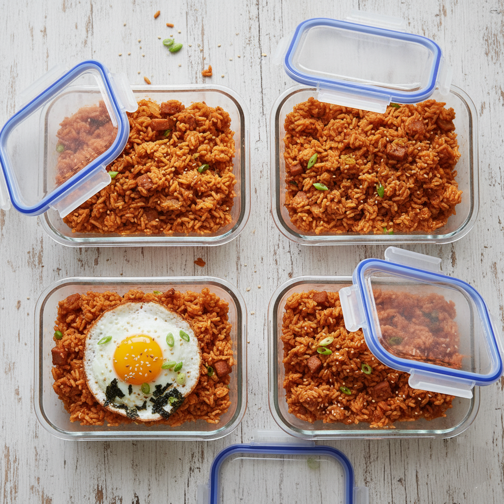 1. Store the Rice Base: Cook the full recipe and portion the fried rice base (rice, kimchi, protein) directly into your glass meal prep containers. Seal them tight.